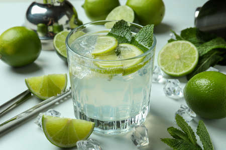 Glass of fresh mojito cocktail and ingredients on white background