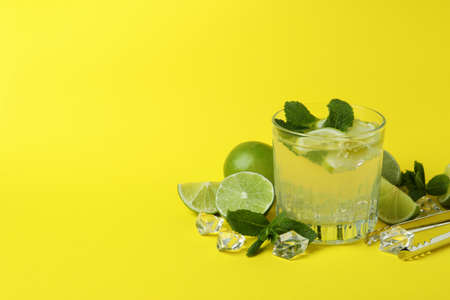 Glass of mojito cocktail and ingredients on yellow background