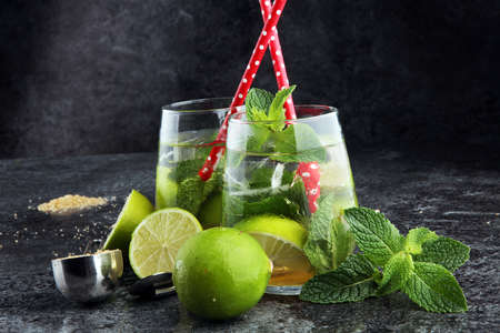 Glass of fresh sour and sweet mojito cocktail with lime and lemon slices and straw