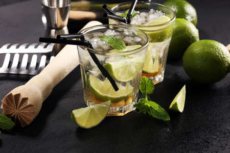 Mojito cocktail, lime and wooden juicer on a dark background. Summer cocktail mojito with lime and mint on a slate board. summer drink concept