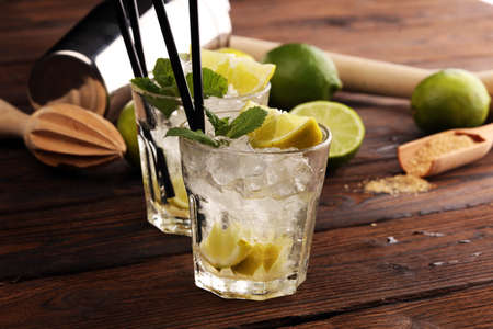 Mojito Cubano or caipirinha cocktail, iced drink with lime and mint
