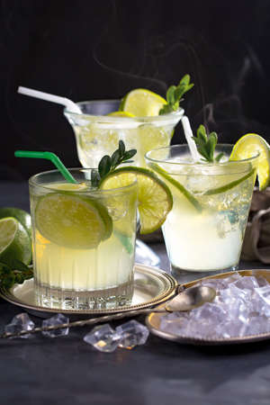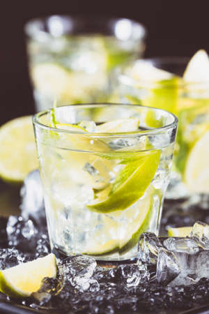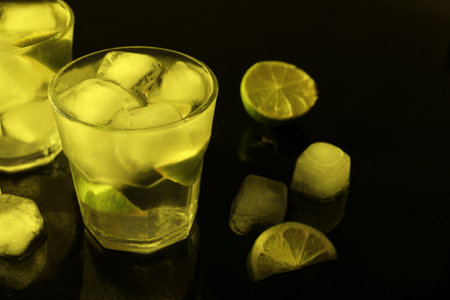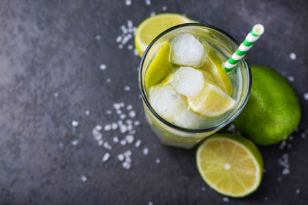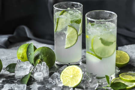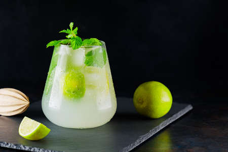 Fresh lime cocktail with ice on dark background.