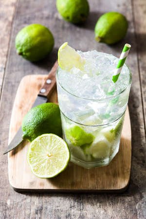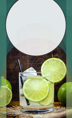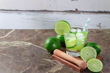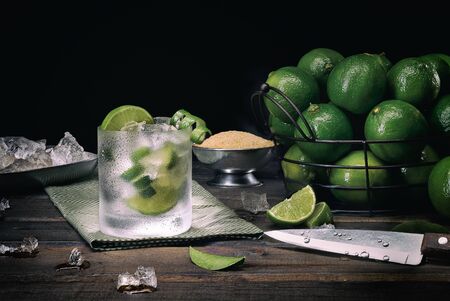 Caipirinha of Brazil cocktail with fruit lime on a table. invigorating and cold drink with ice