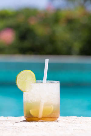 Glass of Caipirinha cocktail on the pool nosing at the tropical resort. Vertical, cocktail on right side