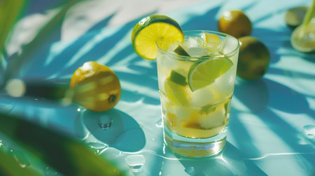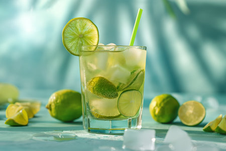 Refreshing caipirinha cocktail with lime on blue background, perfect for a summer vibe