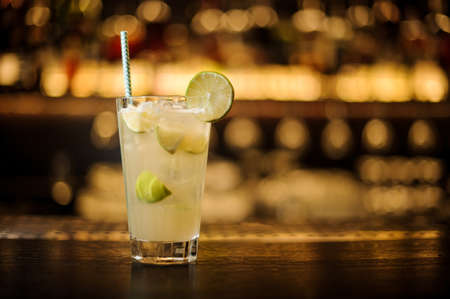 Caipirinha cocktail in glass on wooden table background.