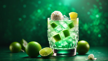 Cocktail with lime and ice on green bokeh background