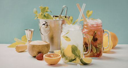 Mason jars of fresh mojito on table. Banner design