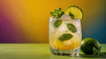 Mojito cocktail with lime, mint and ice on colorful background