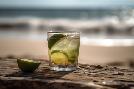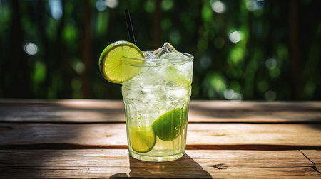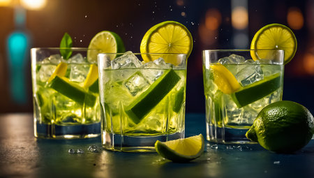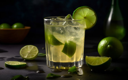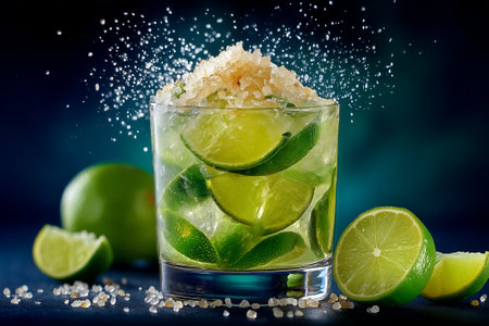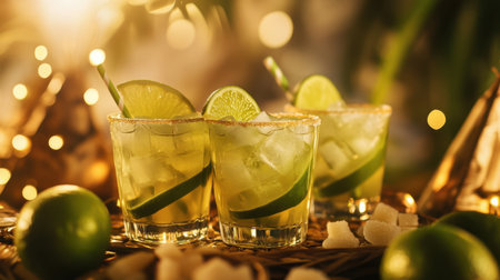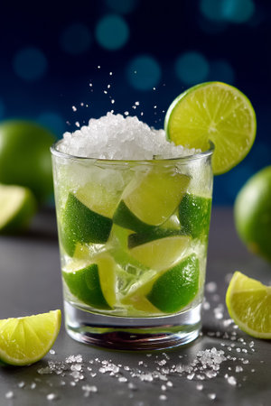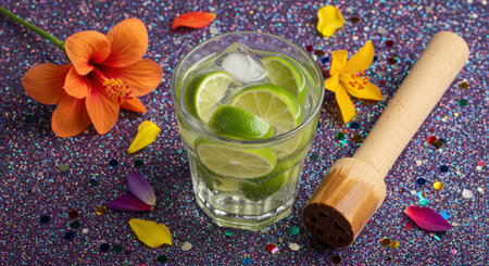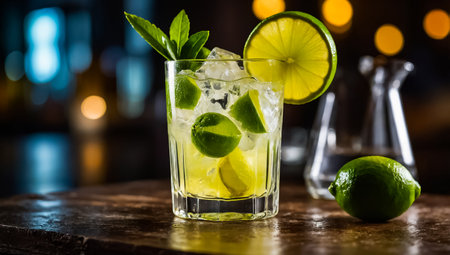 A refreshing Caipirinha, Brazil's national cocktail, with lime slices and ice, is served on a sparkling background for a carnival.