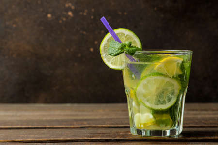 Mojito cocktail in a glass glass with lime, mint and lemon on a wooden brown table