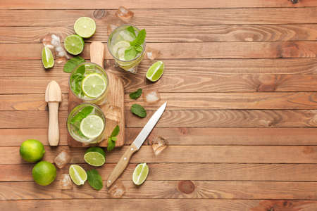 Glasses of fresh mojito on wooden background