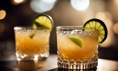 two glasses of margarita mix in a glass with ice and lime on a bar counter