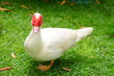 Muscovy ducks roaming on the grass in Organic Farm in Thailand. Beautiful male Muscovy duck. Close up.