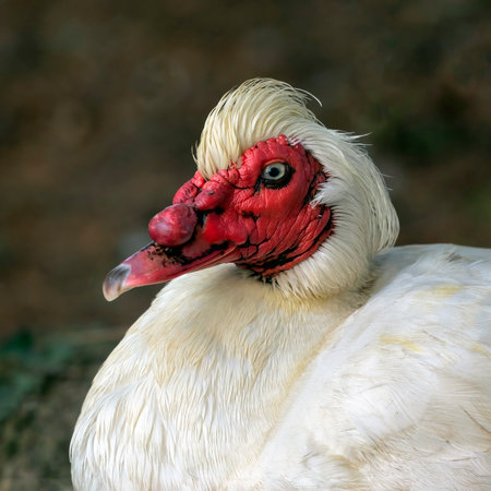 a close up portrait of the head of a muscovy duck, cairnina moschata. It has white feathers and a red face. No people and space for text copy