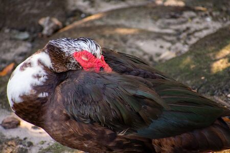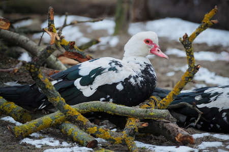 The Muscovy Duck (Cairina moschata) resting inside a petting zoo.