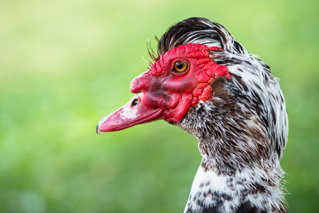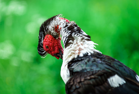 Beautiful muscovy duck with red head oon green background