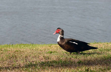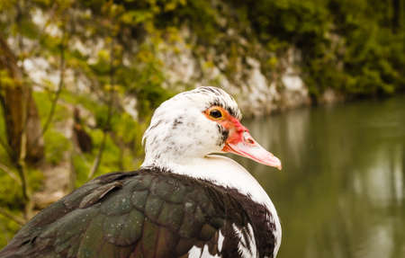 The Muscovy duck (Cairina moschata). Close up portrait of a large duck, native to Mexico and Central and South America, standing on the beach close to the pond in city park