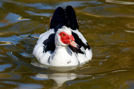 White and black duck with red head, The Muscovy duck, swims in the pond. The Muscovy duck, lat. Cairina moschata is a large duck native to Mexico and Central and South America.