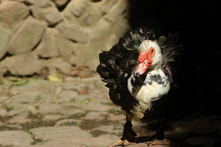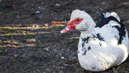 Muscovy black and white beautiful duck outdoors during the day.