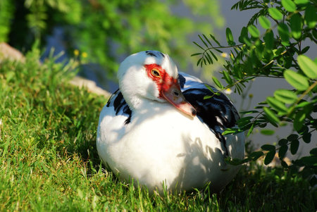 Muscovy duck resting on green grass in park with forest background and summer light