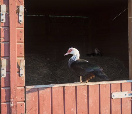 Muscovy duck Muscovy duck Cairina moschata standing on wooden orange stable window.
