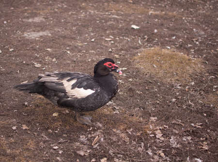 portrait of a domestic dumb duck with Red beak in a hen house, in the pen for chickens in the village, old brown muscovy duck with red nasal corals on a farm at a cloudy day in spring.