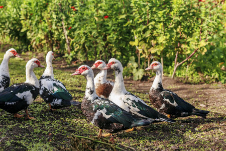 Group of Muscovy ducks foraging on grassy ground near green plants and flowers in a sunny rural farm setting.