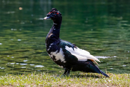 Close-up of a colorful Muskovy Duck at the edge of a green lake, side view, Jardim d`Amazonia, San Jose do Rio Claro, Mato Grosso, Brazil
