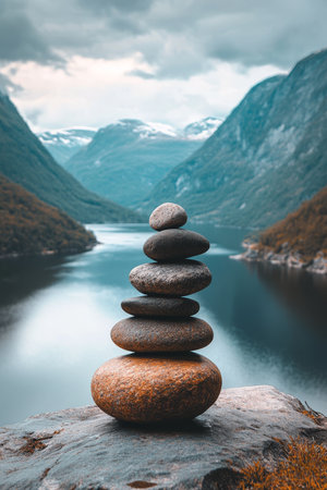 Zen Stones Gracefully Balanced by the Serene Lake with Majestic Mountains in the Background
