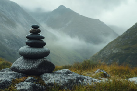 Zen stones are carefully stacked on a smooth rock in a serene landscape featuring a misty mountain range, evoking feelings of peace and balance.