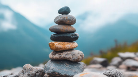 A balanced arrangement of stones is displayed in the foreground, showcasing a visual of equilibrium. The composition features various gray and brown stones, with a soft-focus mountain range in the background. This image could be suitable for meditation practices, wellness content, or general stock photo usage.
