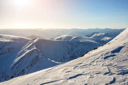 majestic winter landscape of snowy mountains with a clear blue sky in the sunset, the concept of the greatness and beauty of nature