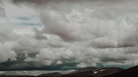 Mountains peaks under the dark storm sky. Dramatic clouds. Jura island, Inner Hebrides, Scotland, UK. Atmospheric landscape. Panoramic view