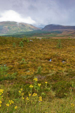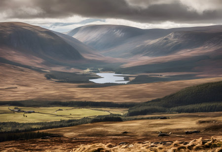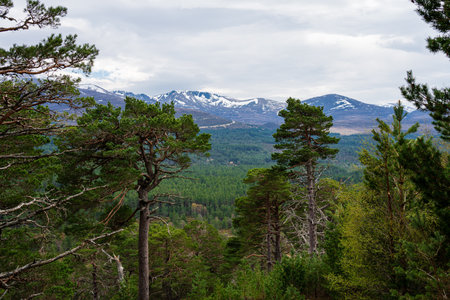Landscape view of Cairngorms National Park in Scotland on a cloudy day