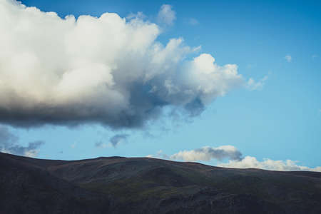Minimalist alpine landscape with mountain silhouette under cloudy sky with big cloud. Dark mountain and light sky. Minimal nature background with silhouette of mountain under large cloud in blue sky.