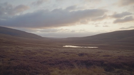small stream running through scottish landscape, captured by stephen shortridge using sigma 85mm f/1.4 dg hsm art lens. the hazy scenery showcases a mix of light gray and dark amber tones. this photo also features the zeiss milvus 25mm f/1.4 ze lens, adding depth to the composition. andre-charles boulle's influence can be seen in the intricate details of the surrounding nature. ai generated