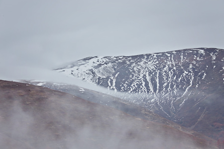Mountains in fog. Peaks under heavy clouds. Silent autumn landscape. Snow on hills.