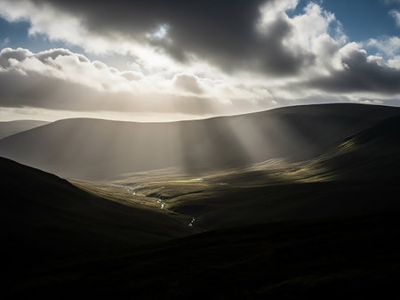 Stock showing dramatic sunbeams piercing through dark storm clouds and illuminating a lush green valley with a winding river and rolling hills in the distance.