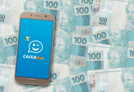 Sao Paulo, Brazil, 08/05/2020 - Caixa App Tem on smartphone screen with Brazilian Real banknotes in the background. Brazil's Coronavirus Aid. Brazilian money. COVID-19.