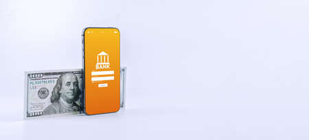 mobile banking network. Smartphone with internet online bank application. Usd money cash on black background. Save currency money wallet