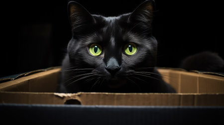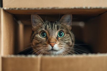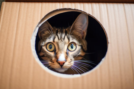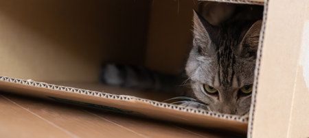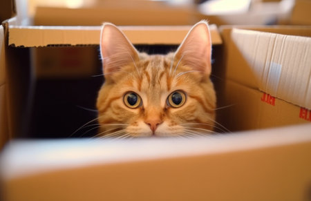 top view of a cats ears and eyes peeking from a cardboard box, created with generative ai