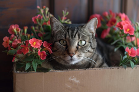 A serene tabby cat lies in a cardboard box surrounded by blooming pink flowers