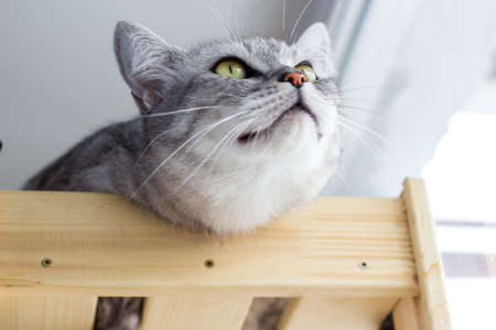 Funny portrait of cat lying like a whale on a wooden shelf looking to the top.