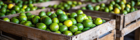 Fresh green limes packed in wooden crates inside a spacious market warehouse