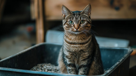 A charming image of a cat sitting beside a litter box, with a slightly confused expression, showcasing the curiosity and antics of felines during playtime.