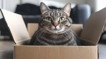 A fat gray tabby cat sitting in a small cardboard box, clearly too big for it, with a playful expression on its face.