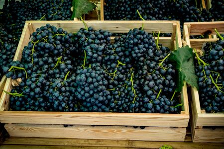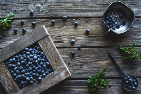 Freshly picked blueberries are in a wooden box. Healthy food, health