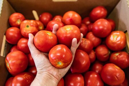 Hand holding up three ripe and bright tomatoes from a cardboard box. Other tomatoes in the blurred background. Local food market sale.