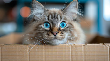 A curious Ragdoll cat peeks out from a cardboard box, its striking blue eyes capturing attention.
